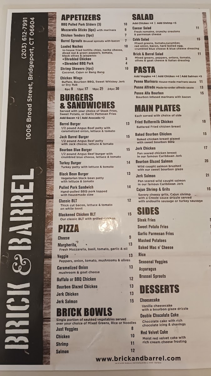 Welcome to Brick & Barrel, a hidden gem nestled in Bridgeport, CT. This vibrant eatery invites you to indulge in a diverse menu that fuses comfort food with unique twists. The star of the show is undeniably the jerk chicken pizza, which customers rave about for its bold flavors. For those seeking an authentic dining experience, the barrel burger paired with a refreshing bourbon punch is a must-try.